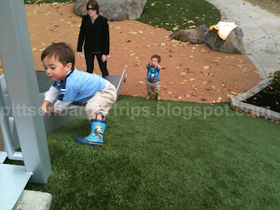 We were a little bummed out when our 'big' neighborhood park was closed for a renovation all summer long : ( But I guess it wasn't too big of a deal since I was too scared to take the boys there by myself because of the really tall jungle gym. There was a grand opening this last weekend and we got to try it out. The best way I can describe it is that it is super duper awesome! It has a very modern feel to it and is designed to include children of all abilities. Little did the designers know but this new park is also perfect for a mama of triplets! I can bring them here by myself and not worry about them falling off the jungle gym. And good riddance to tan bark! I hate that stuff : ) Expect the back drop of this park in many blog posts to come!